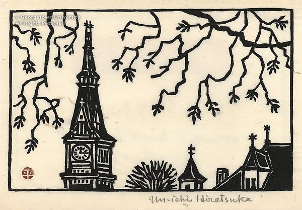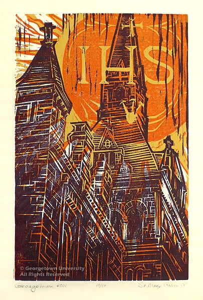 A Dominican nun since 1962, Sister Mary Grace has maintained an active art career with numerous commissions for liturgical events and venues. Sister Mary Grace studied at the University of Cincinnati College of Applied Arts and taught art in public schools before finding her monastic vocation. She moved to St. Dominic’s monastery in Washington, D.C. in 1989 for several years before relocating to Delaware. In her vivid color woodcut, the Jesuit monogram and surrounding sun cast their rays of knowledge and spiritual illumination over the spires and towers of the Healy building.