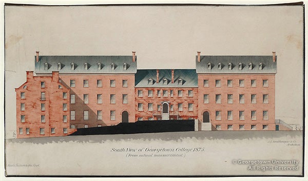 This rare surviving watercolor by architect John L. Smithmeyer shows the elevation of the buildings on the south side of campus. It was made in preparation for designing the Healy building, which was completed between 1877 and 1879. The Flemish Romanesque building, which has become the icon of campus and community, was named for Georgetown’s 28th president and master-planner of the building, Father Patrick F. Healy, S.J., the first African-American president of a major American university. John Smithmeyer and his assistant, Paul J. Pelz, went on to design the Library of Congress Thomas Jefferson building in 1886-92.
