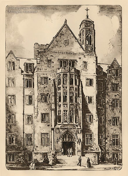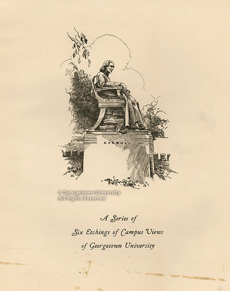 Alexander Levy was born in Bonn, Germany, and trained in Cincinnati and New York with notable American painters Frank Duveneck, William Merritt Chase and Robert Henri. Levy went on to become a successful illustrator, printmaker and book designer in Buffalo, New York. The 1933 Domesday Booke, published in Buffalo (Baker, Jones, Hausauer, Inc.) with watercolor illustrations and designs throughout by Alex Levy, included these six etchings of buildings and scenes from Georgetown’s campus. Published by the senior class, the yearbook was dedicated to the past presidents, “that the memory of these and other leaders of Georgetown University may not be lost to those who pass through her portals.”