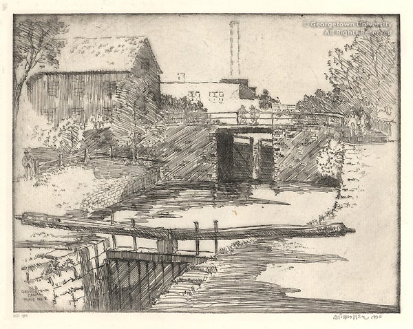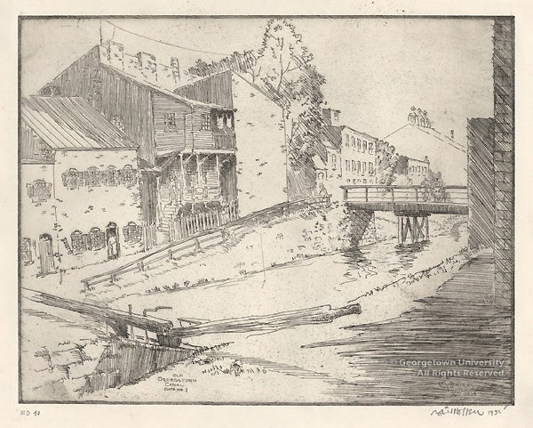 A distinguished local artist who ran the Library of Congress Prints and Photographs Division for many years, Hirst Milhollen specialized in etchings of architectural history, as in these views of the buildings and locks along the canal towpath in Georgetown. Milhollen was also president of the Society of Washington Etchers, and exhibited his work with Joseph Himmelheber and Benson Bond Moore, also represented in this exhibition.