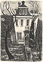 Aline Fruhauf made sketches of the house from the second floor window of the Georgetown public library across the street. In her book, she recalled its architectural features: “Its tiled mansard roof, as somberly iridescent as the feathers of a dark pigeon, was the inverted peach-basket hat of a dowager of distinguished lineage to whom fashion was not only superfluous but highly undesirable.” Twelve years later Fruhauf made a lithograph from her original painting, and found that the house was on the market for sale. She took the opportunity to tour the interior and meet its owner.