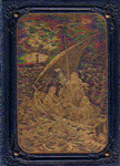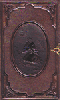 Despite the claim to bind "in the English manner" German edition binders seem, especially in the 1860s, to have routinely broken one of the cardinal English rules by introducing both modelled figures and literal pictorialism into bindings intended to cover titles published for adults. This tendency, by the way, is one which they shared with their Scandinavian counterparts. And as with the attempts at multiple colors, German binders had little fear of handling materials which we now consider unusual. Velvet was established as a commonplace for devotional works from the 1840s, and virtually anything which could be glued to the surface of an embossed cloth binding was, at one time or another. Mother of pearl, metal studs, and composition "cameos" all appear in the exhibit on bindings produced before 1875.