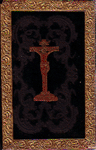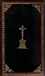 Very dark brown velvet stamped in blind, with applied gold embossed paper borders and inlaid brown embossed paper (?) crucifixes, identical on both covers.