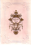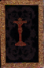 Dark brown velvet with gold embossed paper borders and greenish embossed paper (?) corners and central crucifixes, identical on both covers. Date from bookplate inserted at front.
