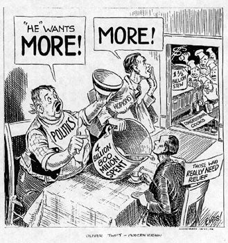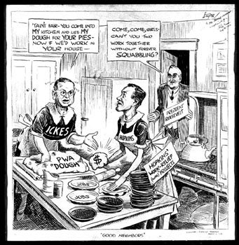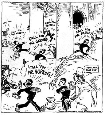 One of the frequent perquisites available to political office-holders at whatever level is obtaining the original versions of editorial cartoons that feature said statesman or political hack. Sometimes the cartoons come direct from the cartoonist, sometimes from a third party, and lately at least sometimes they are just plain purchased. Senator Robert F. Wagner of New York, one of the congressional leaders of the New Deal, referred to such things, when they expressed positive sentiments, as “dope,” and it’s easy to see how an office full of smiling familiar faces might have that effect. And then there was that other New Dealer, Harry Hopkins.
