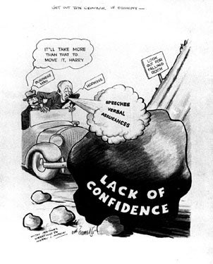 The 21 original cartoons in this exhibit were gathered by Hopkins during the years 1936 to 1940, the period when he first came into Roosevelt’s government as head of the WPA, became Secretary of Commerce, dealt with the 1940 census, and had a very brief fling with ideas about the presidency itself. But by Bob Wagner’s standard very few, if any, of these cartoons could be classed as “dope.” Hopkins takes his chair at Commerce and sits on something very sharp; he blows hot air at a boulder that obstructs the path of his car; he’s portrayed dressed as a Victorian undertaker; with Harold Ickes he’s seen in drag in a kitchen warring over Ickes’s PWA “dough” to Roosevelt’s somewhat amused annoyance; his programs are portrayed as merely a scam to buy votes. And the puncturing of his presidential aspirations receives the approval of the universe.