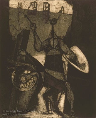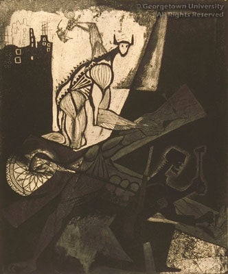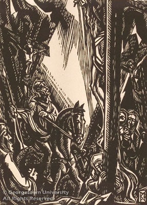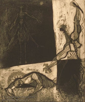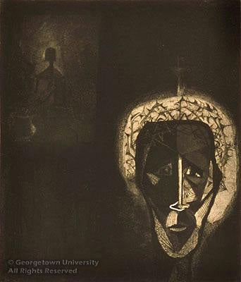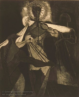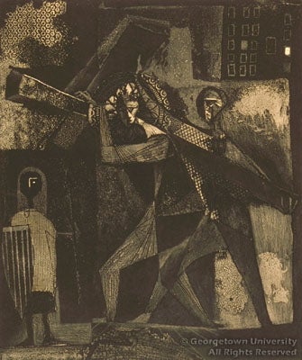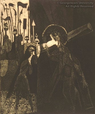 Part I opens with Georgetown's set of Dick Swift's fourteen intaglio prints of the Stations of the Cross produced in 1957 and 1958. They are called intaglios because the artist uses several different methods in working up their images on the copper plates from which they were printed, including etching, drypoint, soft ground, aquatint, etc., as needed to obtain their desired tonal and textural results. Note how Swift has retold the timeless story of the Stations as a 20th century drama, replete with the references to the injustices and sufferings of its wars.