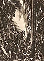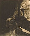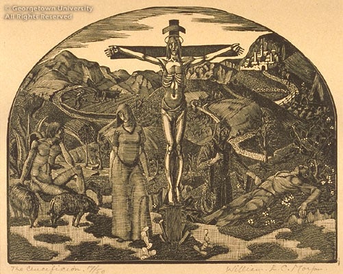 A student of Henry Tonks at London's Slade School, Morgan won the Prix de Rome medal in 1924 in wood engraving, and its three-year scholarship to the British School in Rome. It was there in his first year that he did this engraving of the crucified Christ dying in a rural landscape in the Italian hill country. Note that he peopled it with a traveler on horseback riding off in the distance to a neighboring town, a farmer plowing his field, with another talking to the print's lone woman while keeping an eye on his pigs, and a kneeling monk tending to the needs of a man fallen ill, all going about their normal activities, oblivious to the momentous drama playing out in their midst-a phenomenon which will turn up again in the last print in Part II of the exhibition.