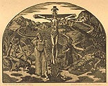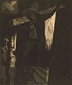 In this print we find the dying Christ crucified on the arms of a builder's construction crane overlooking New York's business district with an elevated train pulling into its station, the nearby river docks and a passing ship, the neighboring buildings with their billboards, and the streets below filled with passing cars, busses, and pedestrians rushing by, oblivious to the drama playing out high above them, not unlike the people Morgan observed and placed in that Italian hill country print seen in the introduction to this exhibit.