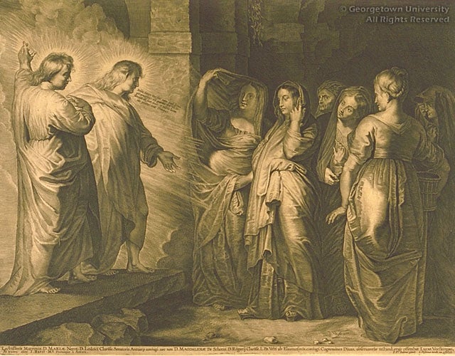 The scene is taken from the 28th Chapter of St. Matthew's Gospel with "Mary Magdelene and the other Mary" having come to inspect Christ's tomb "as the first day of the week was dawning." They were met by the angel who had already rolled back the stone. Noticing their expressions and those of the other women who accompanied them, Vorsterman's angel attempted to reassure them with the following words seen flowing in Latin from his lips: