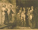 The exhibition reaches its peak here in a print by Lucas Vorsterman, a student of Rubens', and arguably the finest engraver of his master's paintings. Born in 1595, he took up engraving at age twelve, and joined Rubens' studio in 1617. Under Rubens' guidance, he developed an unequaled ability in capturing the expressiveness and nobility of Rubens' figures. Here is his print, "Holy Women at the Empty Tomb," which he completed around 1620, dedicating it to two of Antwerp's important matrons.