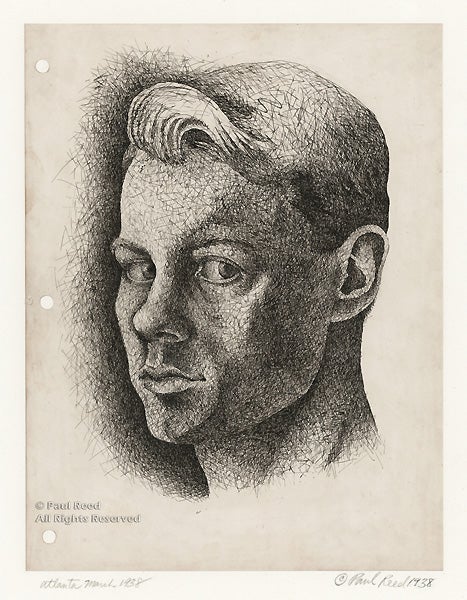 Paul Reed was working in an engraving shop in Atlanta when he drew this masterful self-portrait in the contemporary realist style. The network of fine lines that create shadow and depth reveal his interest in the medium of etching. With eyes trained on his mirrored reflection, his hand skillfully delineates his likeness while with determined gaze he seems to assert his future career as an artist.