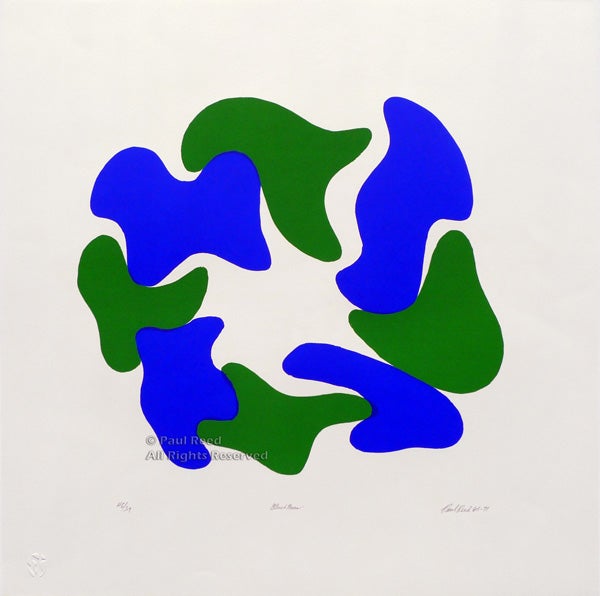 The curvilinear shapes of Reed’s watercolor form a circular frame of floating blue and green petals in this screenprint. This followed a series of fluidly painted, radiating Mandalas, themselves inspired by Jungian psychology. A writer in Art Magazine in 1965 wrote that Reed’s Mandala series recalled “the progressive integration of the unconscious traced by Jung.”