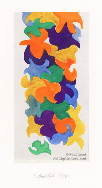 In this study of interlocking biomorphic shapes, Reed’s work was transitioning from the gestural paintings of the previous decade towards the geometric color abstraction of his mature style. A critic at the time compared these shapes to the late paper-cutouts of Matisse which had been exhibited at New York’s Museum of Modern Art in 1960.