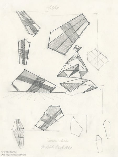 The Topeka study shows the artist experimenting with the spatial orientation of a pentagon, which ultimately resolved with a vertical central axis running up through the narrowest corner. The dynamic form with uneven bands of three layered colors rests on its shortest side.