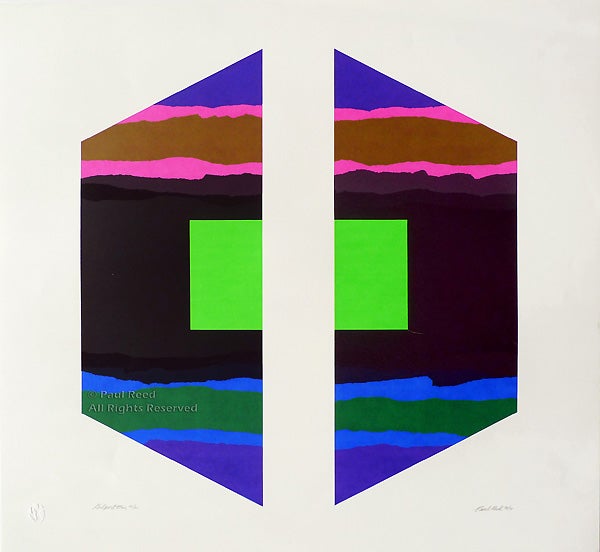 From 1971 – 72 Reed produced the Gilport paintings consisting of two parts nailed directly to the wall. This is one of two screenprints he created from the series. They consist of two trapezoidal shapes placed side by side against the longest edge. The intervening space is equal to the width of the bisected green rectangle hovering in the center. The jagged edges of pink and blue horizontal bands contrast with the cold geometry of the rectangle and trapezoid in a visual dialogue of space, color and form.
