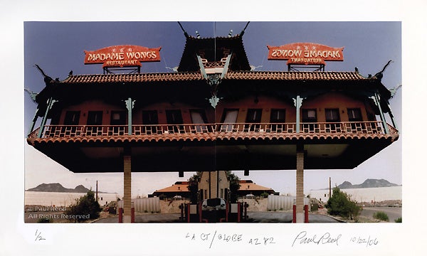 In this photograph, mirror images of a restaurant in L.A.’s Chinatown are curiously merged atop mirrored images of a bank in Globe, Arizona.
