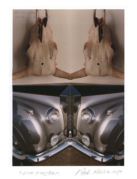 Reed was staying on a ranch 30 miles from Scottsdale, Arizona, when he made these photographs of a bull’s skull that hung over his bed. The ranch was owned by art dealer Riva Yares, whose gallery, founded in 1964, still exhibits the work of contemporary artists. The ranch was an ideal place to work in solitude and find inspiration in natural forms. This work’s title refers to the tiny image of the artist reflected in the chrome fender of a vintage Rolls Royce he saw at an auto show in Phoenix.