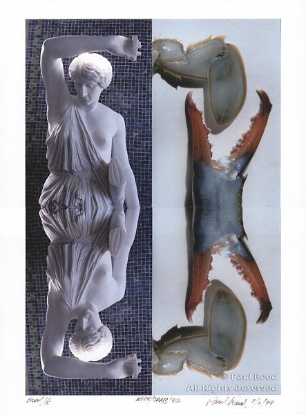 In this compelling Quad photo, Reed contrasts a classical statue from the Roman pool at the Hearst Castle in San Simeon, California with a soft shell crab the artist cooked and ate along the western shore of the Chesapeake Bay where he had stayed in the 1960s. The gray shell of the crab continues the lines of the statue’s bent arm, and the outlines of the red claws seem visually to echo the outlines of the sculpture.