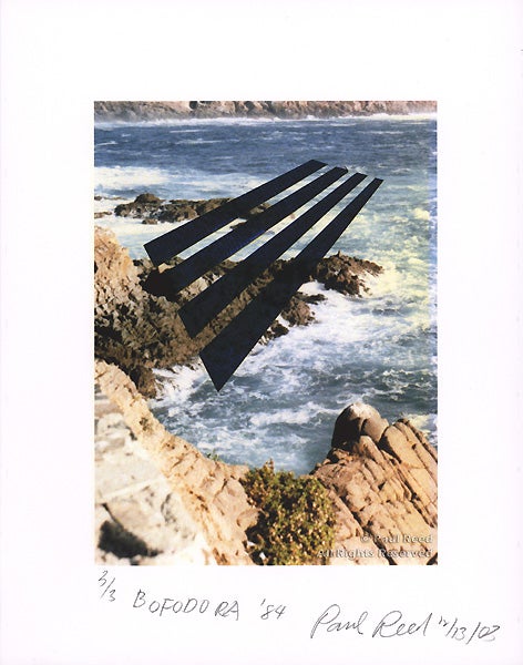 In this computer generated print, Reed’s signature “platform” shape is superimposed over a photograph of a blowhole along the coast of Baja California. The presence of the four receding bars flattens the space and challenges our perceptions of depth. This is another medium in which Reed explores spatial compression and contrasting forms, as seen in the paintings Alpha (1953) and Boden (2001).