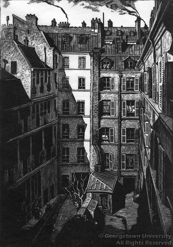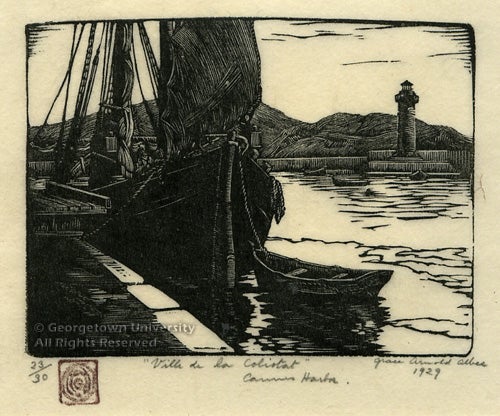 The next period of Grace Albee’s life, a six-year sojourn in Paris, France from 1928 to 1933, represents a crucial time of artistic flowering in her printmaking career. Albee’s years in Paris encapsulate the pivotal moment when she shifted away from working according to amateur artistic standards and turned towards a model of artistic professionalism. This transition commenced in March of 1928 when Grace Albee traveled, along with her husband and her five sons, then ranging in age from five to fourteen, from Providence across the Atlantic Ocean to Paris, the undisputed center of the art world. Along with her husband, Grace expected that joining the expatriate community in Montparnasse would advance her career and teach her valuable lessons about her art. With her several young children, unusual at the time due to the severe loss of young men in World War I, Albee at the beginning of her stay in Paris was recognized in the French community more through her identity as a mother, called la mère à cinq fils; she became increasingly known professionally for her art as her technical skills improved and her exhibition presence expanded. Embarking upon one of the most productive periods in her career, Grace advanced and perfected her art to include wood engraving and gained entry into the French salons, exhibited her works at independent French galleries and at art shows back home in the United States. All of these venues gave her opportunities to receive significant positive press from French and American art critics, which was instrumental in strengthening her professional reputation. The pinnacle of her artistic career in Paris is embodied in her first one-woman show at the American Library in Paris in March of 1931.