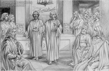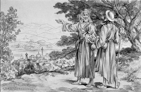 This drawing of Jesus preaching to the Apostles, for the cover of the 1950 calendar of the Society of the Propagation of the Faith, is the largest in Georgetown's J. Watson Davis collection.