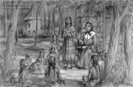 Marguerite Bourgeoys (1620 - 1700) was one of the early religious leaders of the mission at Ville-Marie (now Montréal). The drawing also depicts Kateri Tekakwitha (1656 - 1680), an Iroquois orphan who took her vows near Montréal in 1679.