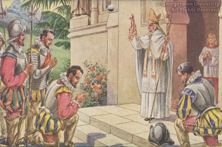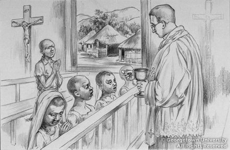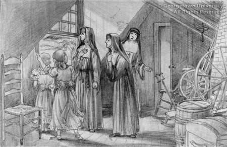 A number of the J. Watson Davis drawings are of similar size, pictorial theme, and narrative style as the drawings for the Society for the Propagation of the Faith calendar studies; but they have no dates or other notations that would suggest a publication history. Three of these drawings, shown here, depict groups of sisters at important moments in U.S. history. Missionary activity in French Canada appears to have been a subject of interest to Davis and those who commissioned his work; Georgetown's collection contains four of such episodes, and the 1948 Calendar depicts one related scene. The drawing labeled "Franciscan Brothers" depicts a setting or episode unknown to us at this time.