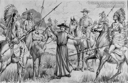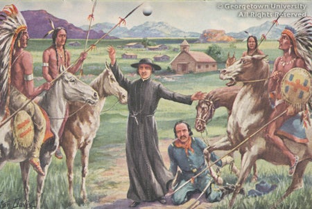 A note in the margins by an unknown hand reads, "Have chapel in place of the cavalry officer, who is to be shown lying on the ground." A comparison with the illustration that was used in the 1948 calendar shows the changes incorporated, enhancing the drama of Father de Smet intervening to save the officer's life. Georgetown University's Special Collections has a distinguished collection of letters and books from Father de Smet.