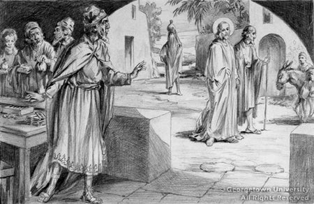 This scene, from Matthew 9:9, Mark 2:14, and Luke 5:27-28, was perhaps most famously depicted by Michelangelo Merisi da Caravaggio in 1599 (Contarelli Chapel, Rome); Luca Giordano's 1700 version (shown below) is one of the most important works in the Georgetown University Art Collection, and is on view in Carroll Parlor (Healy Hall Room 107). Unlike those Italian Baroque renditions, which focus on the moment of Jesus choosing his new Disciple ("follow me"), J. Watson Davis' drawing emphasizes the choice Matthew makes as he rose to abandon his earthly vocation (in shadows at the left) for his new calling (illuminated at right). Jesus identifies his new follower not with a dramatic arm gesture, but with a subtle turn of his head.