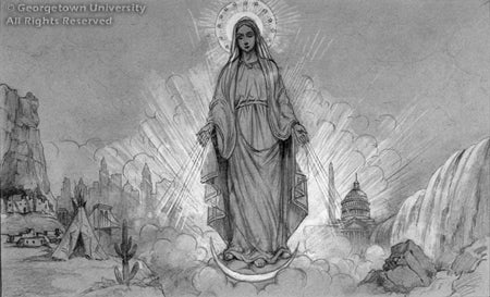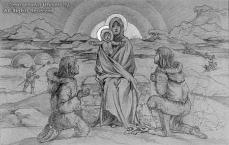 Veneration of Mary has assumed local imagery, legend, and historical circumstance in a number of places around the globe. In or about 1941, J. Watson Davis completed several drawings that depict Mary, or the Mother and Child, in fanciful geographical settings-Africa, India, Japan, Java, and, shown here, the Arctic and the United States. Among the most fascinating and expertly rendered of the Georgetown drawings, the other four are unfortunately too fragile to exhibit.