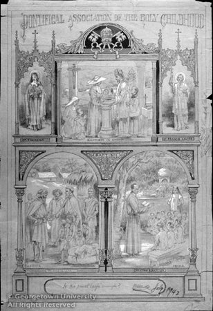 These pencil drawings with occasional touches of white gouache, many of which were preparatory studies for publications of the Society for the Propagation of the Faith and other organizations, augment the Art Collection's holdings of work by U.S. artists, and of art significant to the University's Catholic heritage. As preparatory studies, many of the drawings contain editorial comments in the margins; this provides insight into the creative processes of an artist working from life models and adapting his work to paintings to be used for mass-produced color printing.