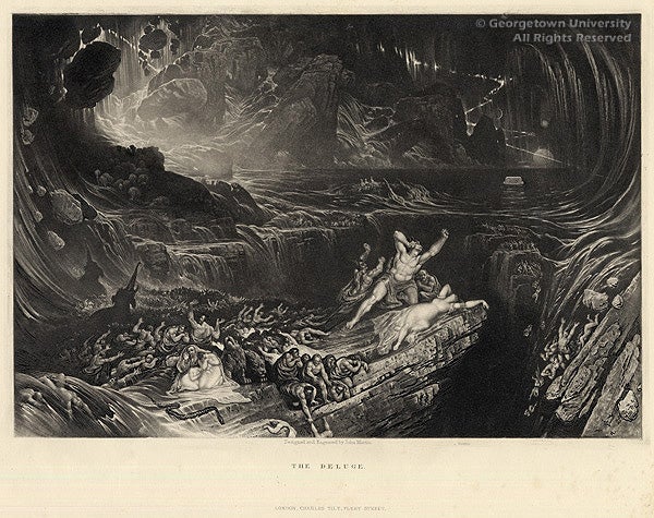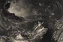 The Deluge story from Genesis fascinated Martin, who made two paintings and two mezzotints of it. The earlier Deluge, painted prior to his Bible mezzotints, was so popular he released a mezzotint edition in 1828. A printed brochure accompaniment revealed his sources in science, scripture and literature (Lord Byron’s poem Heaven and Earth, 1824). Martin was influenced by his contemporary the French naturalist Georges Cuvier in his belief that the Biblical Flood was caused by a disastrous confluence of the sun, the moon and a comet. He painted a second version of The Deluge in 1834, which won a gold medal at the Paris Salon.