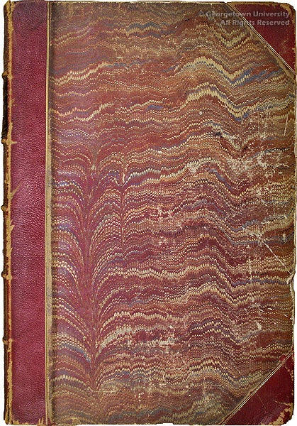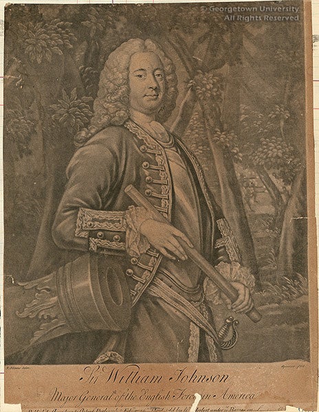 This mezzotint by Charles Spooner, showing Johnson in his officer’s uniform, was published in London in 1756 to commemorate his appointment as superintendent of Indian affairs for the northern department. Though faded and frayed with age, this historic engraving has an important provenance connected to Georgetown. A paper label on the reverse explains that it once hung in the Riggs mansion at 1617 I Street, N.W. Mrs. George Washington Riggs was a daughter of Thomas Shedden of Glasgow, Scotland, and a distant relative of Sir William Johnson. Her son, E. Francis Riggs (1851 – 1910), gave the funds to build Riggs Library in the Healy building, completed in 1891 in commemoration of his father and deceased brother, T. Lawarson Riggs, who had once attended Georgetown.