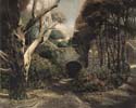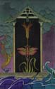 The artist here gives Fort Tryon Park in New York City a far lighter touch. The delicate coloring calls to mind nineteenth-century hand-tinted photographs rather than the stark graphic quality of black-and-white movies. Dappled light and shade impart a dreamy quality, with a definite flavor of nostalgia that fully excludes the bleak or the industrial.