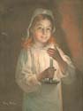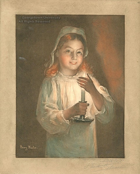 This sentimental image of a young girl illuminated by the glow of her candle was copied from a painting (now unlocated) by the award-winning history and genre painter Henry Mosler (1841 – 1920). The German-born artist grew up in Cincinnati, Ohio, was employed as a Civil War sketch artist for Harper’s Weekly, and later studied art in Düsseldorf and Paris, where he resided from 1877 – 1894. Georgetown owns three large paintings by Mosler, on view in the Old North Building: The Birth of the Flag, Washington Crossing the Delaware, and The Victory of the Bonhomme Richard, all published in the Mentor magazine in 1913.