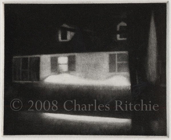 Charles Ritchie came to Washington, D.C. after completing his Master of Fine Arts degree at Carnegie Mellon University in 1980, and now works as Associate Curator of Modern Prints and Drawings at the National Gallery of Art. For over a decade, Ritchie has been exploring the sites in and around his suburban Virginia home. He is dedicated to the landscape, “both visible and metaphorical.” The rich effects of the mezzotint technique create shadowy depths from which an eerie glow emerges in this view of the artist’s house. The image was featured on the cover of the Summer 2002 issue of The Washington Print Club Quarterly. As Terry Parmelee wrote of it at the time, “Simplification of form, exaggeration of light or shadow, and subtle adjustment of shape contribute to a unique style that defies the description of ‘realism.’”