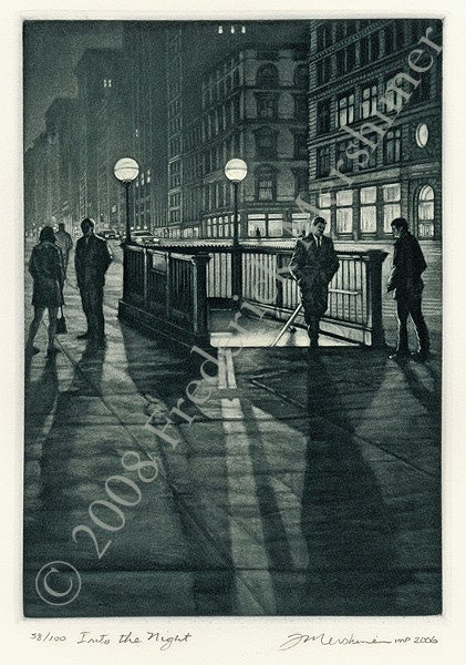 Georgetown is honored to have the largest institutional collection of Mershimer’s works, with a total of 26 prints. Displayed here is the artist’s recently released catalogue raisonné that records 95 superbly crafted mezzotint engravings from the years 1984 to 2006. Published by Stone + Press Gallery of New Orleans, this deluxe edition of the catalogue, of which there are 100, includes the small print Into the Night. The quintessential view of a New York subway entrance is located at 23rd Street and Broadway near the Flatiron Building.
