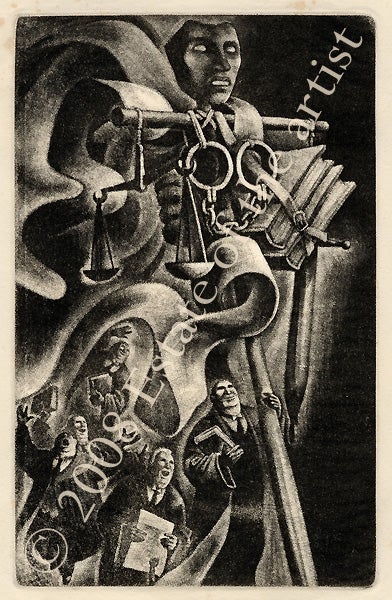 These mezzotints lampooning the litigious world of lawyers and judges by award-winning illustrator Lynd Ward were published along with eight other images satirizing other professions in a special edition of Erasmus’s Moriae Encomium, or, The Praise of Folly in 1943. During his youth Ward’s moral outlook was shaped by his father, a Methodist minister sympathetic to social causes. Ward received his Master of Fine Arts degree from Columbia University’s Teacher’s College in 1926 and married his future collaborator and fellow graduate May McNeer the same year. While honeymooning in Europe they settled in Leipzig where Ward enrolled in the National Academy of Graphic Arts, studying the techniques of printmaking and book design.