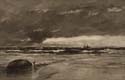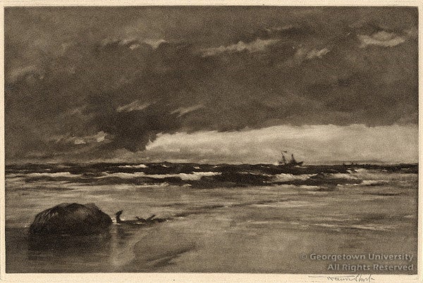 On the encouragement of art critic John Ruskin, Sir Frank Short made many mezzotints after the paintings of Turner and other painters. It is his original compositions however, often featuring scenes of water, which count among the high points of British printmaking. Lifting Cloud was made after a watercolor sketched by the artist on the solid bedrock beach of Whitby Scaur in Yorkshire.