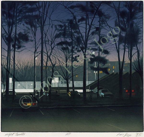 New York artist Peter Jogo captures the silence and stillness often found in urban landscapes. With masterful use of the subtlety only possible with mezzotint, played against strong silhouettes and deep shadows, the artist develops evocative nocturnal settings. The soft, ethereal quality of black and white provides a foundation on which the artist builds his multi-plate color mezzotints, allowing for a particular richness, depth and texture, and creating inviting spaces for pause and reflection.