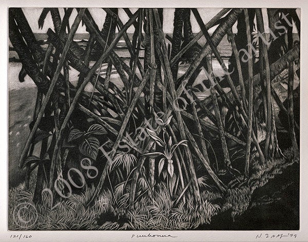 The Print Club of Albany commissioned an edition of 160 prints of Puuhonua as its 1999 annual presentation print. Zaage, a longtime supporter of environmental preservation groups in his home area, wrote in the prospectus for the print: “Puuhonua, Hawaiian for ‘Place of Refuge,’ is a site on the Big Island that my wife and I visited during a short vacation stay in the Hawaiian Islands. Much of my work employs the imagery of sub-tropical flora and at this site the grouping of these tangled Mangrove like stems caught my eye as a potential mezzotint.”