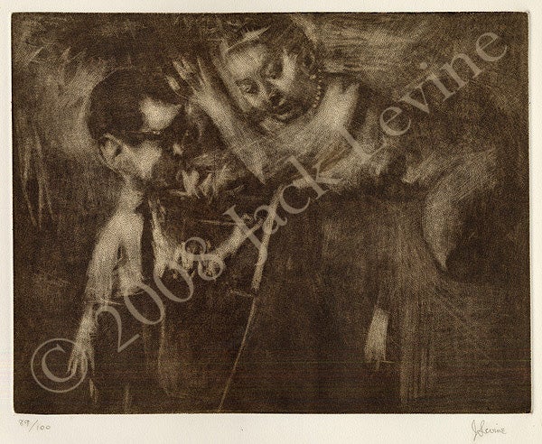 Painter and printmaker Jack Levine grew up on the South side of Boston and began his training at the Boston Museum of Fine Art. He has had a successful and prolific career painting contemporary-themed subjects often in satirical or humorous overtones, with titles evoking the works of Old Master painters. In his twenties Levine worked as an artist for the Federal Works Progress Administration, and his first major success came with the Museum of Modern Art’s acquisition of his 1937 painting The Feast of Pure Reason. After serving in the Second World War, Levine traveled to Europe on a Guggenheim fellowship. His politically charged paintings of the 1950s were exhibited in New York at the Whitney and the Modern, and it wasn’t until the early 1960s that Levine became involved with printmaking, perhaps through his friendship with print publisher Abe Lublin of the New York Graphic Society.
