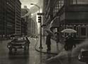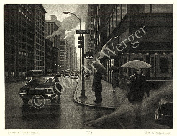 The city scenes of Art Werger adopt the visual vocabulary of cinema to create scenes fraught with tension and isolation. Film noir techniques of perspective and point of view place the viewer as an omniscient voyeur, in the middle of the action yet not a participant.