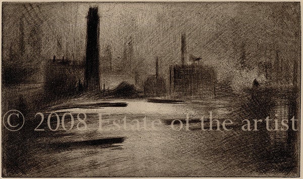 Through the many volumes he published on printmaking, Pennell played a prominent role in the revival of interest in the graphic arts in America. A prolific and experimental printmaker, Pennell produced over 900 intaglio prints and over 600 lithographs during his lifetime. In his book Etchers and Etchings (1919), Pennell called mezzotint “the most fascinating and maddening method of making a print that ever was invented.” His Shot Tower and the Bridge, a wartime view of London, was included in the volume as an example of “drawn mezzotint.” In this preferred, simplified method, the image was “drawn” on the plate with the dots of a roulette wheel, instead of the traditional and laborious method of rocking the plate prior to burnishing the image out with a scraper.