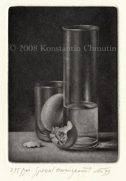 Konstantin Chmutin’s dramatic chiaroscuro technique recalls the lighting effects used by Rembrandt—a particular influence on the artist—and makes the most of mezzotint’s unique ability to portray light and dark with strength, richness and depth. The thoughtfulness with which the everyday objects are rendered transforms this still life from the mundane to the meditative.