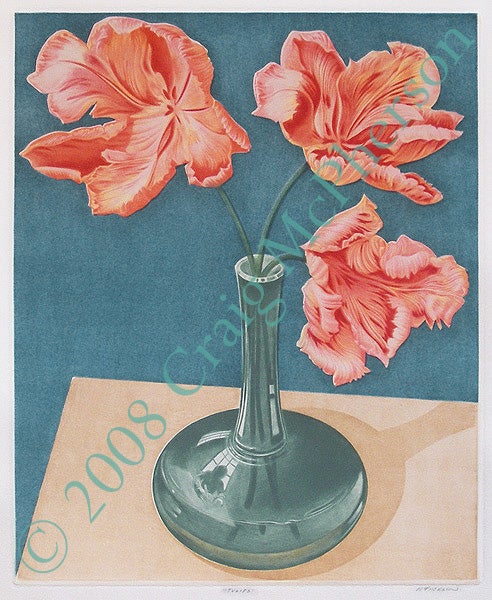 This floral still life represents a departure for McPherson from his larger body of work, both in tone and subject matter. The colorful tulips are presented in a bright clear light, drawing attention away from the artist’s self-portrait reflected in the convex form of the vase.