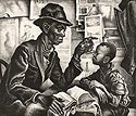 Don Freeman, printmaker and illustrator of children’s books and newspaper articles, was captivated by life in New York, habitually sketching scenes and crowds wherever he went. Freeman studied at the Art Students League under John Sloan, whose etching of a similar subject appears below. From Sloan he learned to depict a crowd of people as a composite entity, and the importance of storytelling in art. In this image one can sense the claustrophobic conditions on the New York subway, where almost all the passengers are engaged in some form of reading. They seem to pivot around the two central female figures; one straining over her shoulder to read the headlines of the newspaper behind her. Freeman created this lithograph while employed at the WPA’s Federal Art Project, in an edition of 25. This impression, however, is a later offset created for Don Freeman’s Newsstand (Vol. 1, No. 3), a self-published magazine of graphic humor and social commentary that he sold by subscription beginning in 1936.