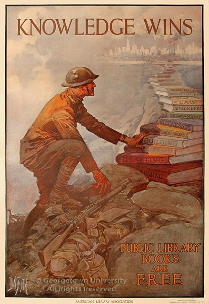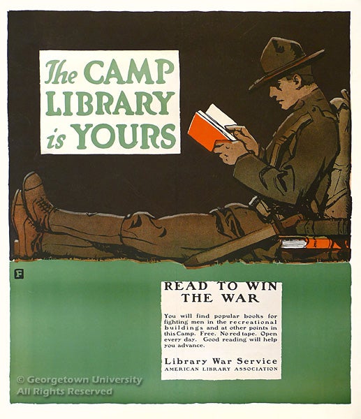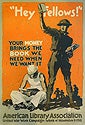 The three posters on this wall advertise the Library War Service, established by the American Library Association in 1917. The Library War Service established 36 libraries in active military camps and distributed library books to over 500 additional locations during World War I.