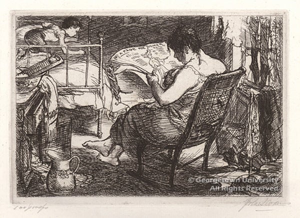 The creator of more that 300 etchings, John Sloan was a master of the technique and one of the leading American artists of the early twentieth century. As observed by Jacob Kainen in the catalogue of John Sloan’s etchings, “He was the witty observer who found an essential humanity in the commonplace.” Between 1905 and 1906, Sloan created ten etchings for a series entitled New York Life which were strikingly modern in their unvarnished depiction of contemporary life. Part of this series, The Woman’s Page was in fact rejected—along with three others—from an exhibition of the American Watercolor Society, for being “vulgar” and “indecent.” The woman and child depicted were tenants in a furnished apartment behind Sloan’s 23rd Street studio. One of the artist’s favorite prints, he considered it “the best all-around example, both in subject matter and treatment.”